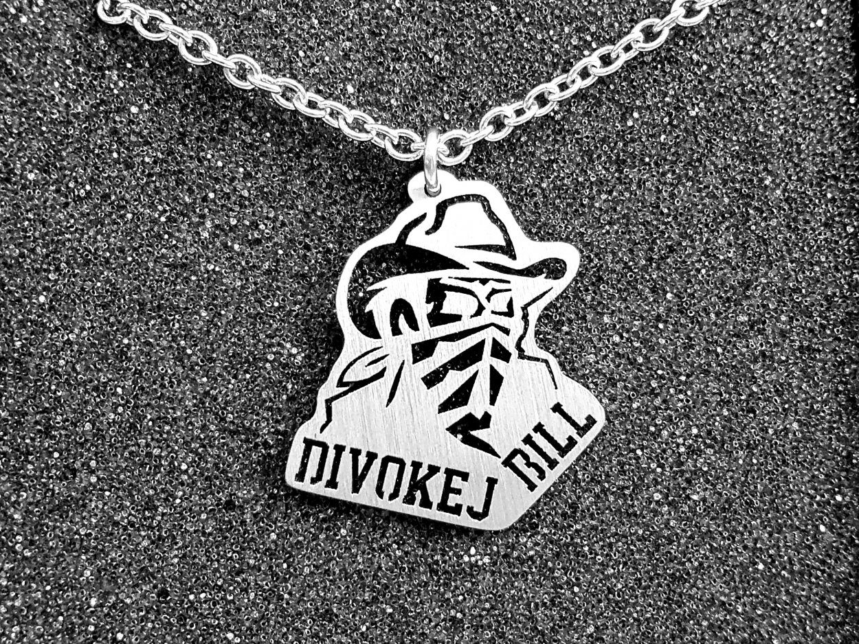 Přívěsek z hypoalergenní chirurgické oceli s oběma motivy našich legendárních log - kovbojem a kulatým logem s hvězdami.